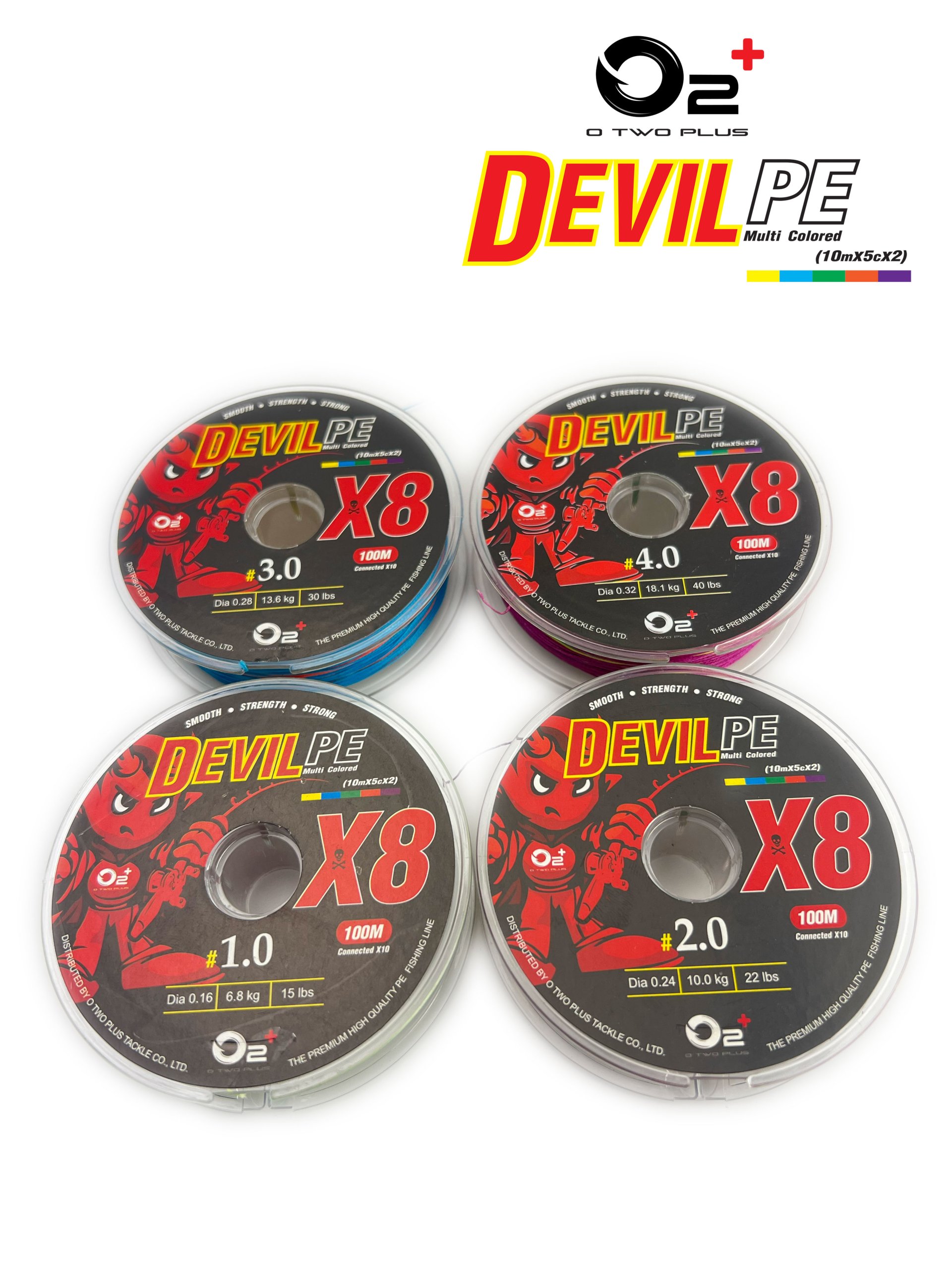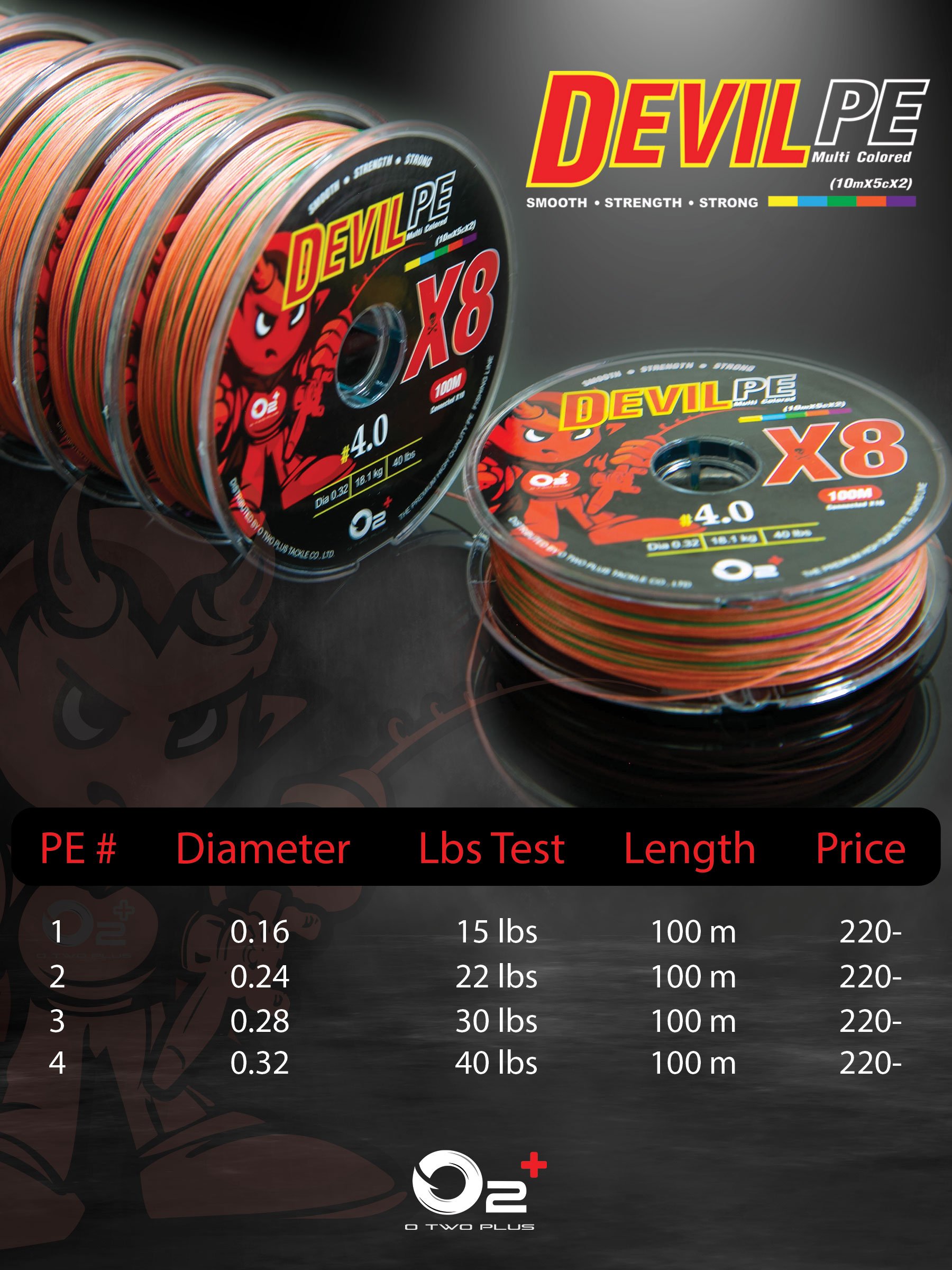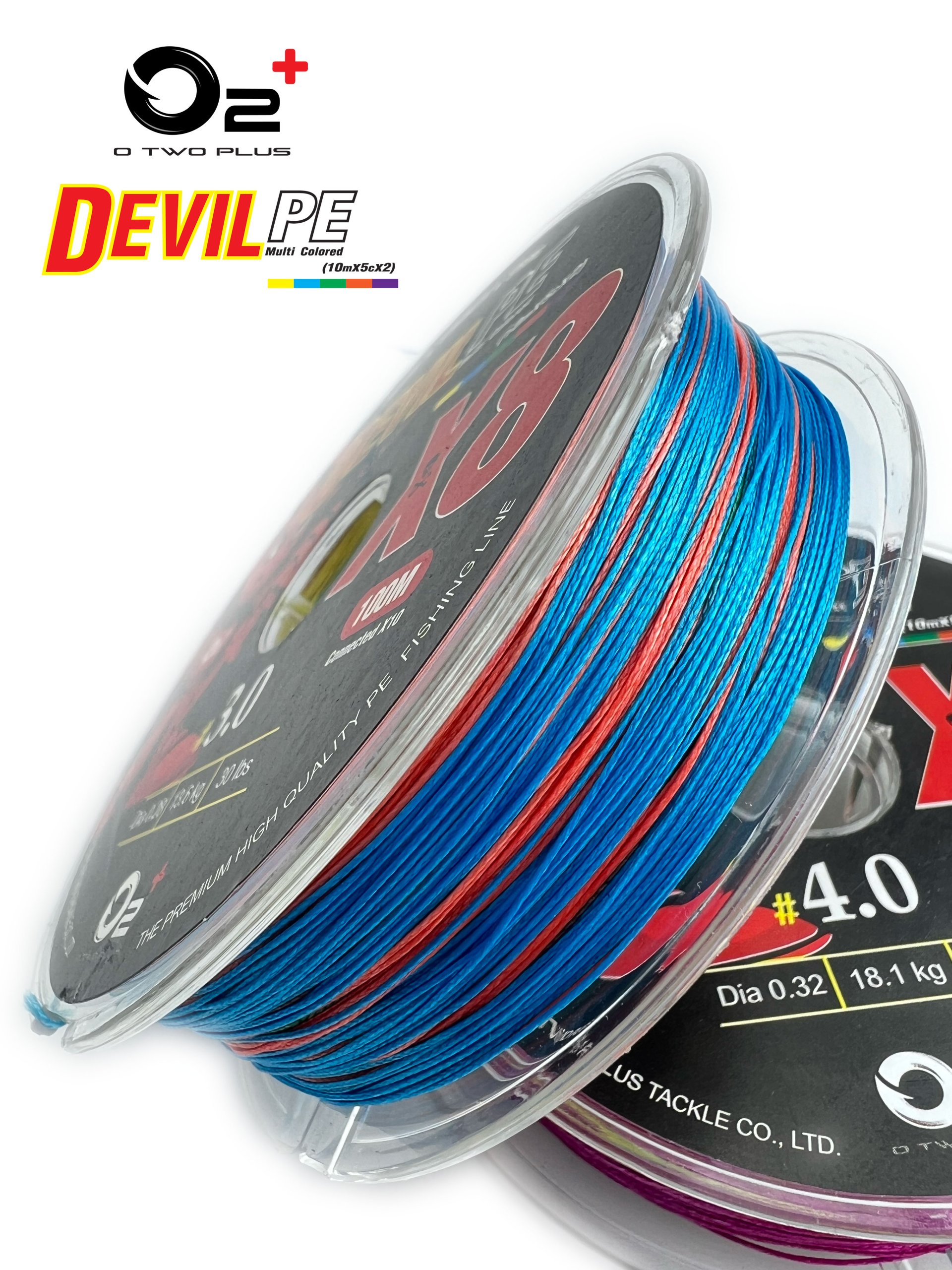 สายพีอี เจเนอเรชั่นใหม่จากโอทูพลัส เป็นสาย 8 เส้นถัก ความยาว 100 เมตร มีสีบอกความยาวทุกๆ 10 เมตร จำนวน 5 สี
